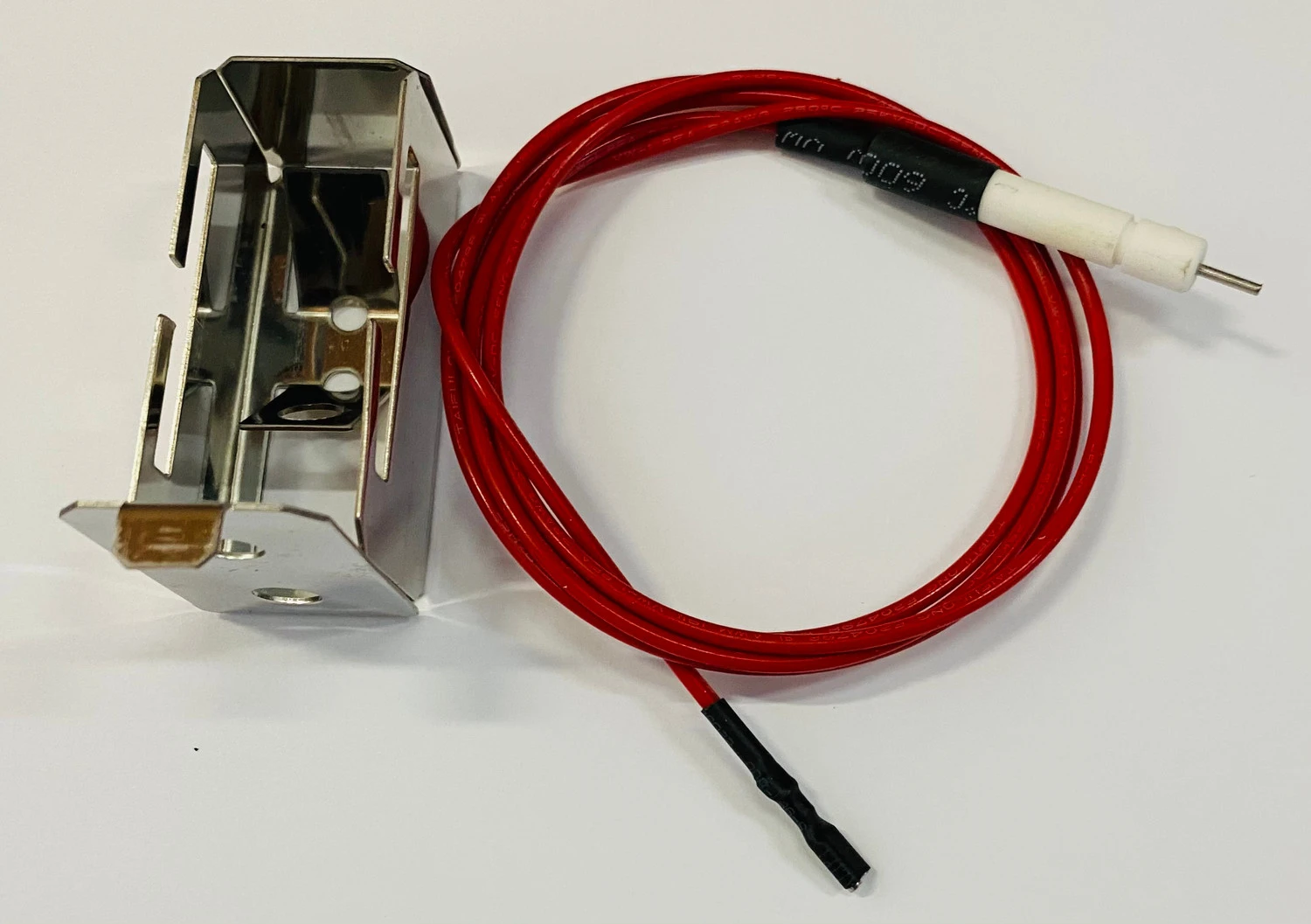 This aftermarket DCS U Burner electrode, collector box and extra long 41″ wire has a flat female spade gets plugged into a 9 volt spark generator. This electrode would be used for 48″ grills needing extra long wires to reach the furthest burners..
